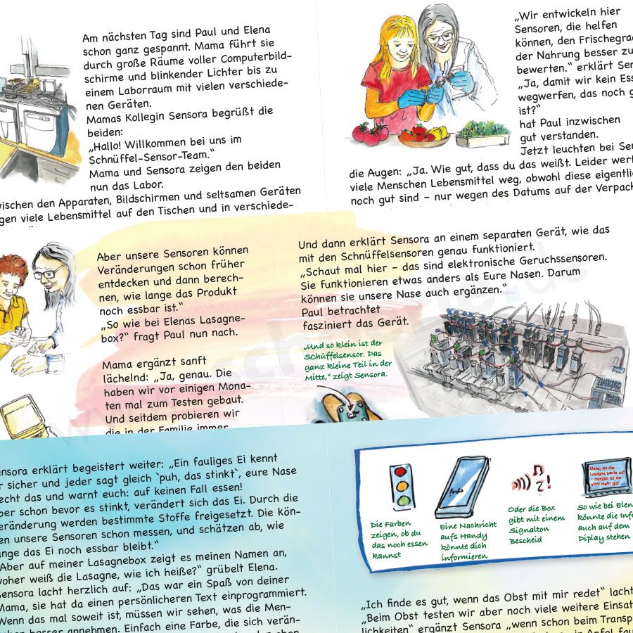 Mit Hilfe von Elenas Mama und ihrem Team im Forschungslabor erfahren die Kinder mehr über die Entwicklung von Schnüffel-Sensoren und wie diese helfen können, die Zukunft unserer Ernährung zu gestalten.